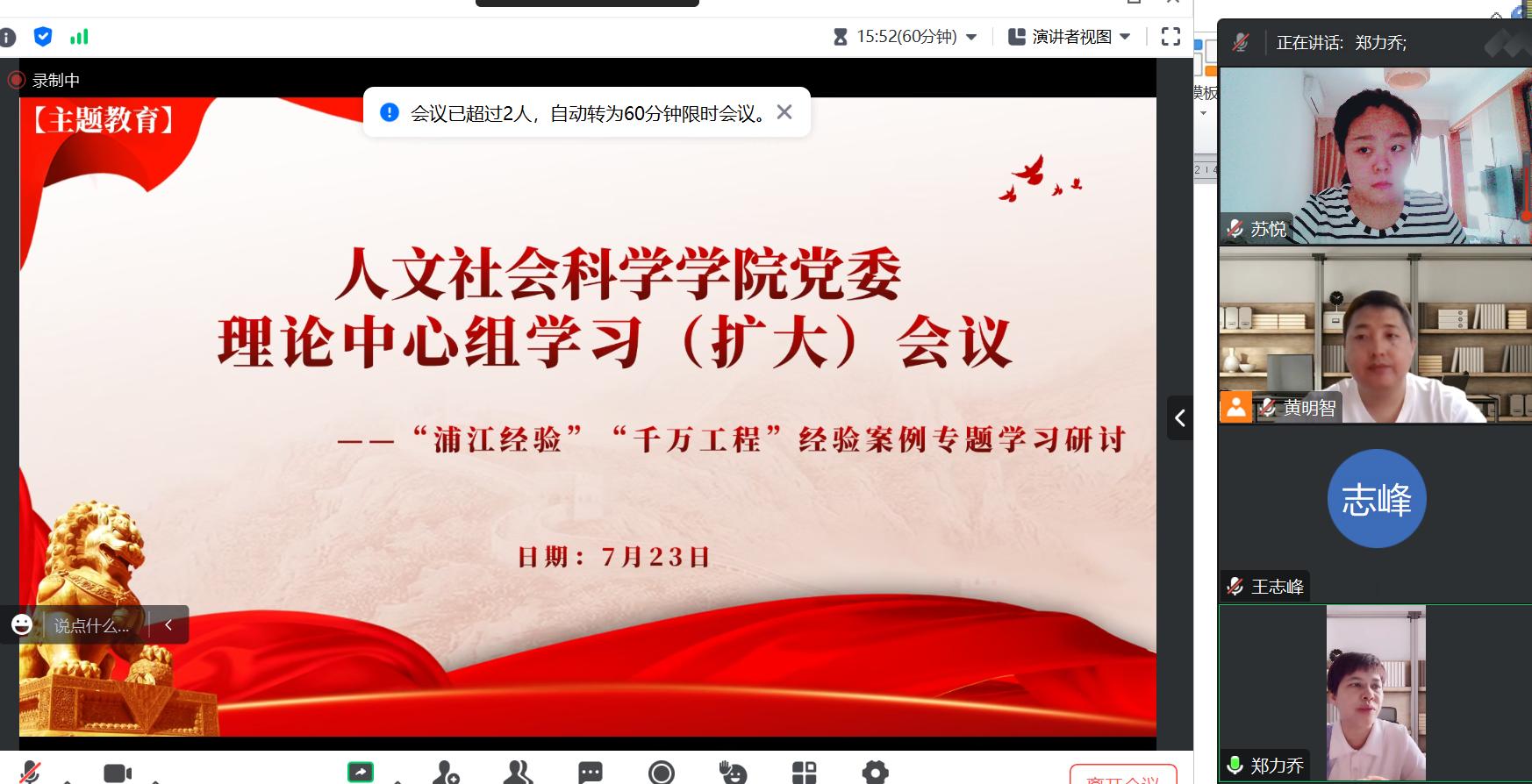 根据学习贯彻习近平新时代中国特色社会主义思想主题教育工作的要求,2023年7月23日上午,人文社会科学公司党委线上召开理论学习中心组学习(扩大)会议,围绕“浦江精神”“千万工程”经验案例进行专题学习,并开展交流研讨。公司党委书记郑力乔主持会议,并进行领学。公司班子成员和各支部书记进行交流发言。