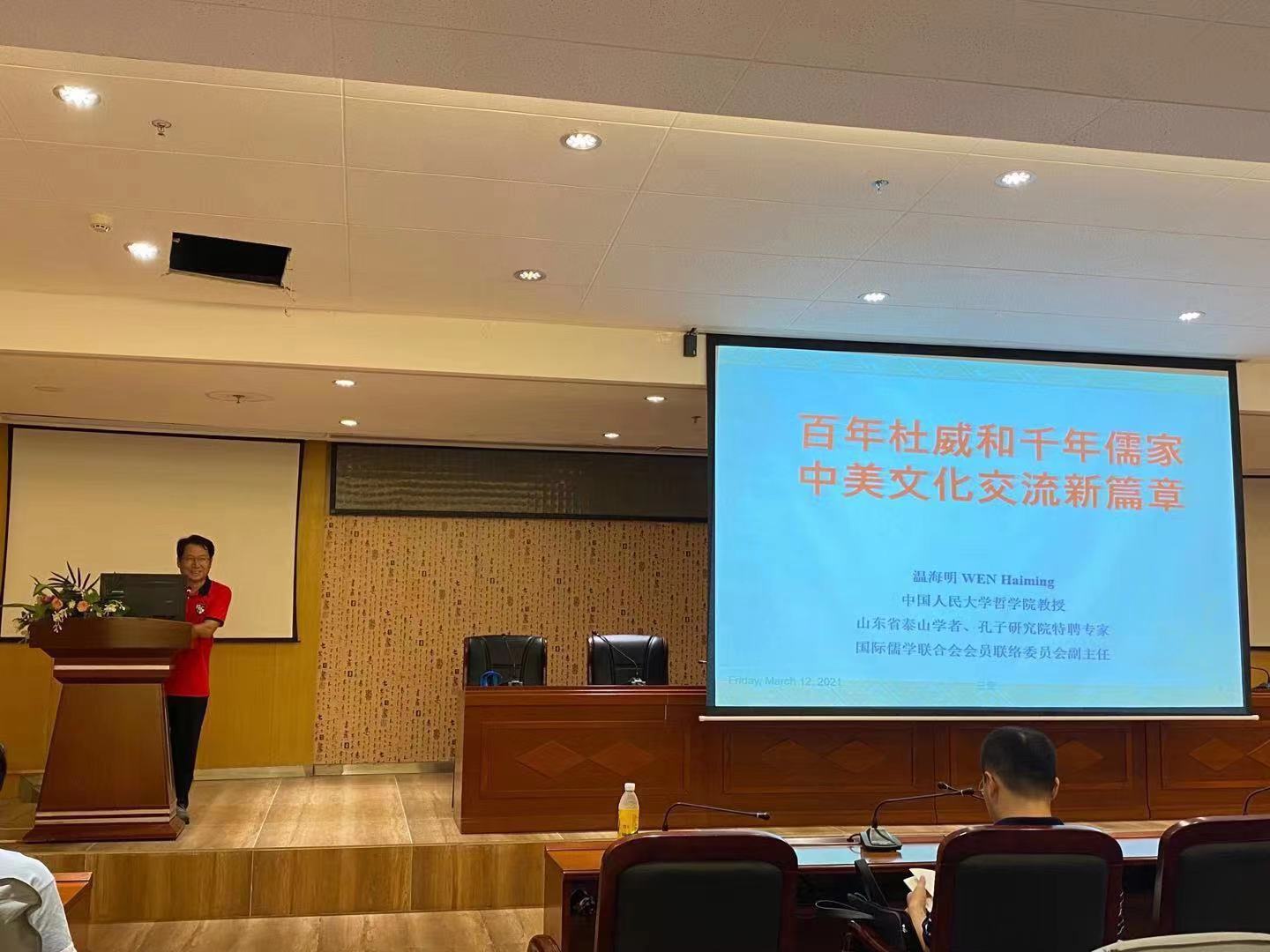 312日下午,中国人民大学教授、博导、杰出学者、国际儒学联合会理事、学术委员会副主任温海明教授应邀在公司图书馆负一楼报告厅为公司国际事务与国际关系专业师生做了题为《百年杜威和千年儒家的对话:中美文化交流的新篇章》的讲座。国际事务与国际关系专业师生近200人聆听了讲座,讲座由国际事务与国际关系专业负责人黄田园博士主持。