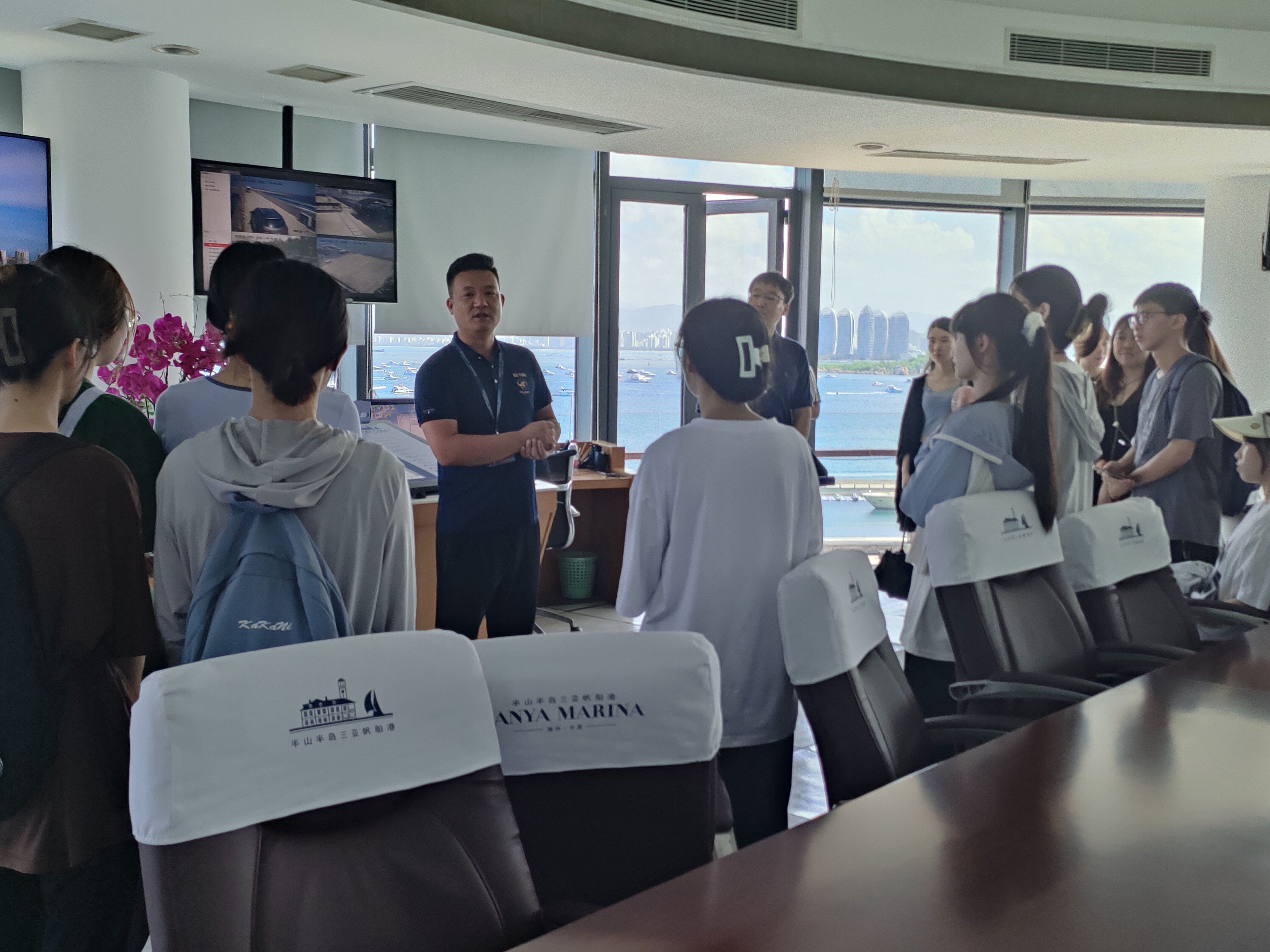 本次活动由专业负责人肖玮老师和课程负责人张逢博老师带队,国关20班47人除1人病假,其余46位同学全体参与专业见习。本次活动为期半天,在活动中,三亚帆船港港口管理部总裁庄海林先生亲自带领专业师生参观了美丽的帆船港码头,并登上帆船港指挥中心塔台眺望帆船港全貌,围绕帆船港的发展现状、基础设施以及港口的运作机制与管理模式等进行了全面细致的讲解。